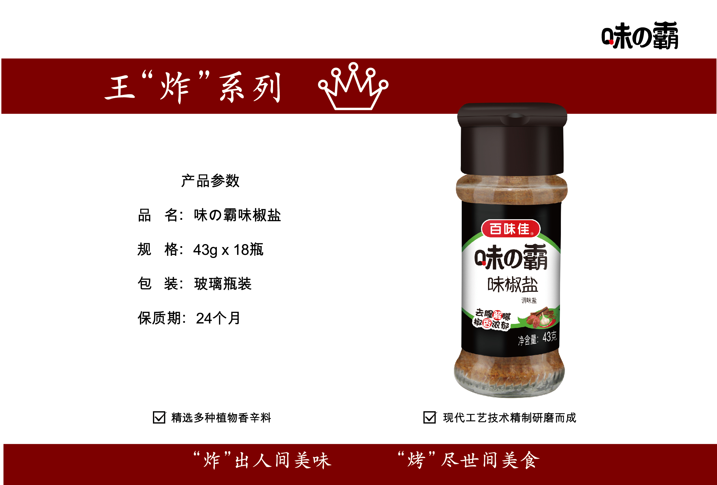 味の霸味椒鹽 相關(guān)產(chǎn)品: 味の霸味椒鹽 味の霸胡椒粉2016/07/08 味の霸香脆炸粉2016/07/08 味の霸香辣炸粉2016/07/08 味の霸蒜香炸粉2016/07/08 味の霸面包糠(黃糠)2016/07/08