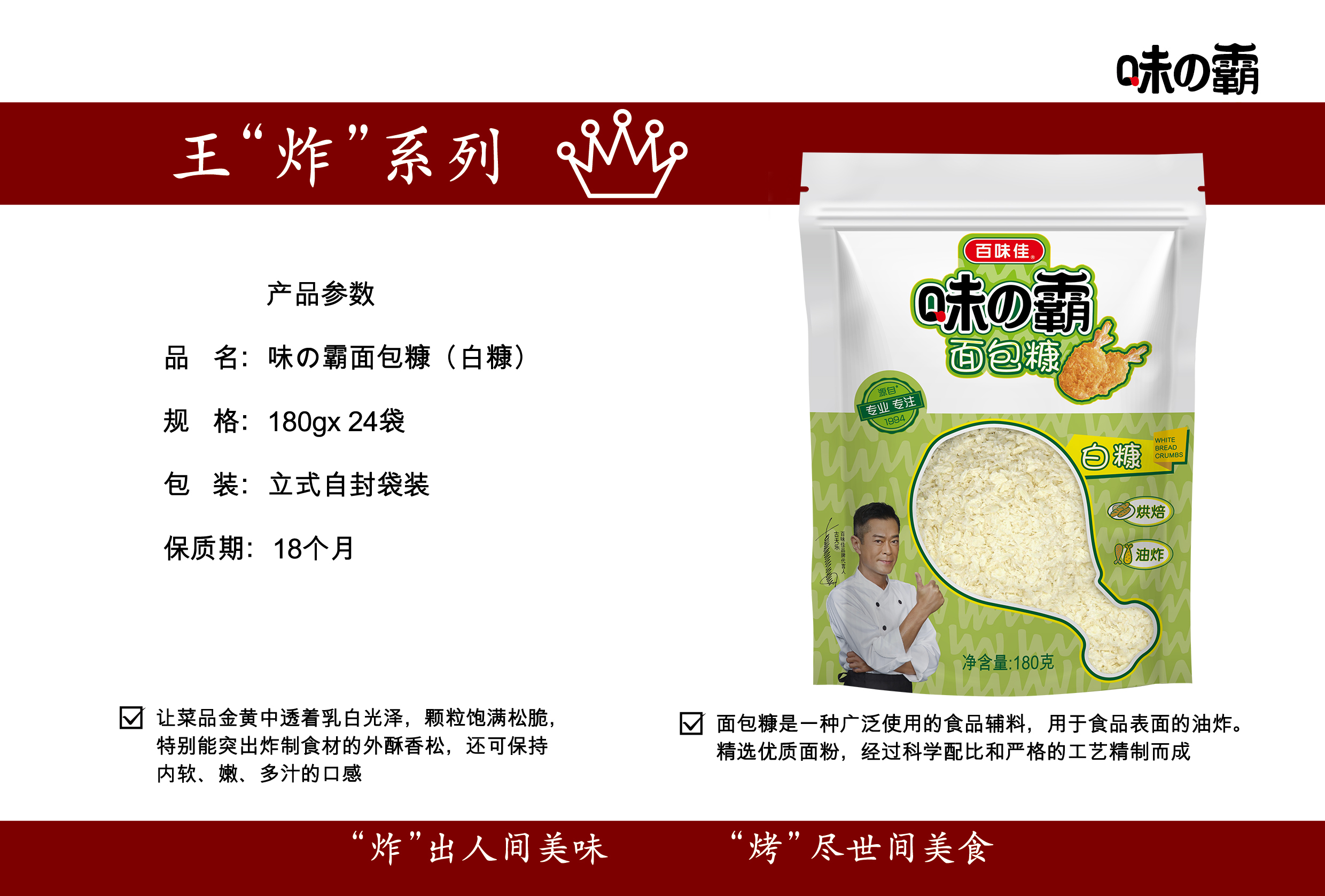 味の霸面包糠(白糠) 相關產(chǎn)品: 味の霸面包糠(白糠) 味の霸胡椒粉2016/07/08 味の霸香脆炸粉2016/07/08 味の霸香辣炸粉2016/07/08 味の霸蒜香炸粉2016/07/08 味の霸面包糠(黃糠)2016/07/08