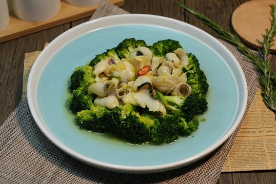 2、清水煮沸加鹽和油,下西蘭花焯熟,撈出沿碟邊擺盤;